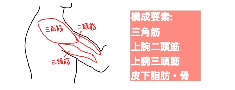腕には、三角筋・上腕二頭筋・上腕三頭筋・脂肪組織があります。