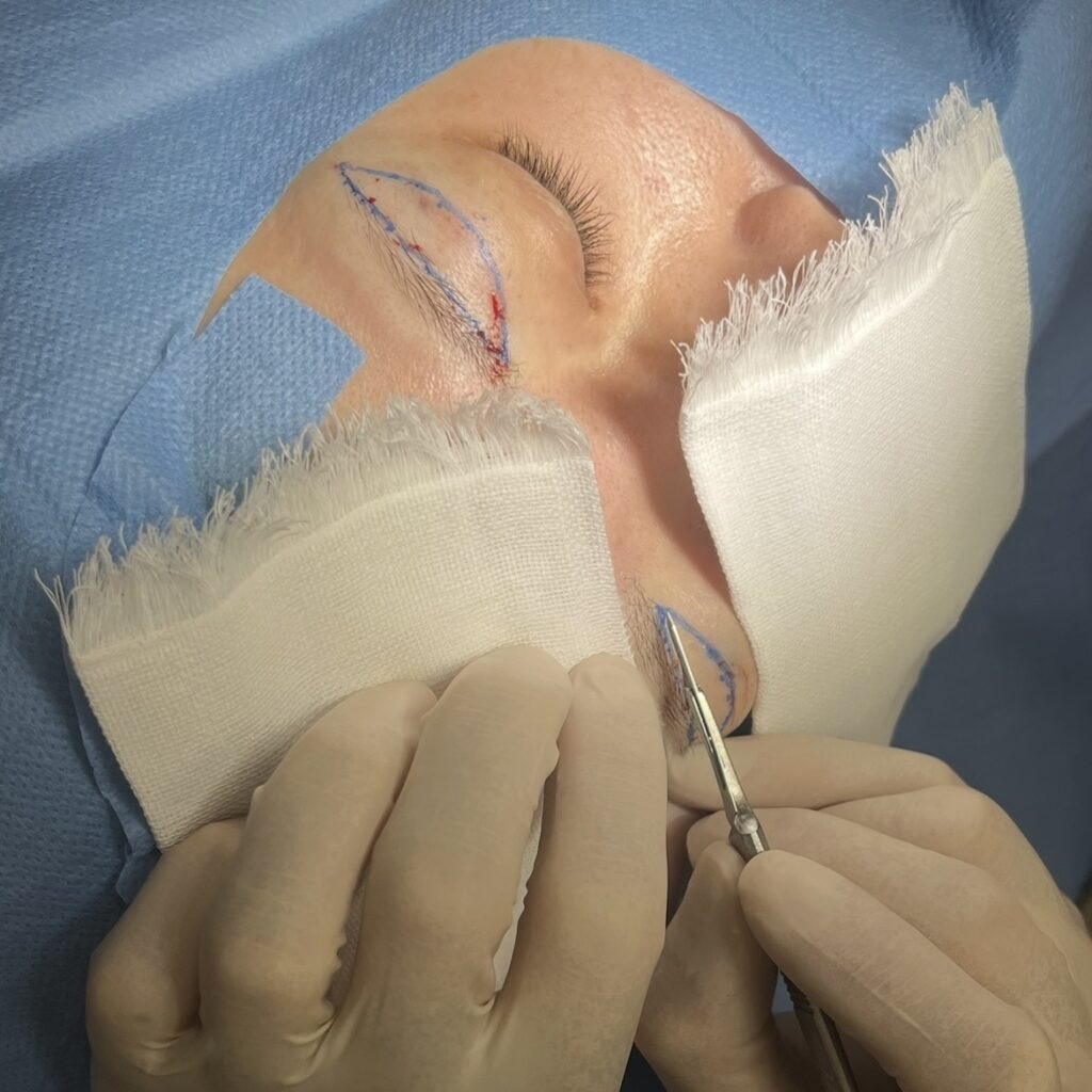 通常の眉下切開では、皮膚切除ですが、脂肪の重みがあれば、皮下にある脂肪も切除します。ただし、取り過ぎると、凹み変形しますのでバランスが大事になります。