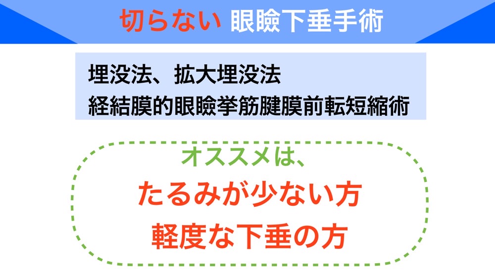 手術方法は、切らないタイプと切るタイプに大きく分けることができます。眼瞼下垂の重症度・たるみの程度・まぶたの形態をみて、慎重に術式を検討していく必要性があります。