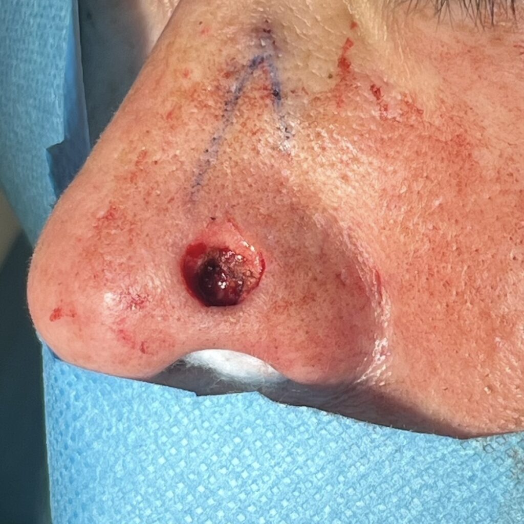 上記のように単純縫合できない場合には、切除後再建が必要となります。次の症例は、鼻背から局所皮弁術を行っています。