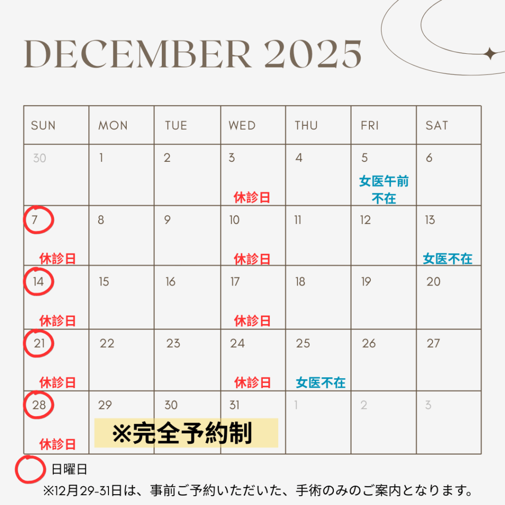 年末(29日ー31日)は事前にご予約いただいた手術のみの対応となります。通常の診療は27日までとなりますので、ご理解の程よろしくお願い致します。
