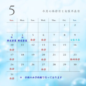 5月の診療日と女医不在日のお知らせ